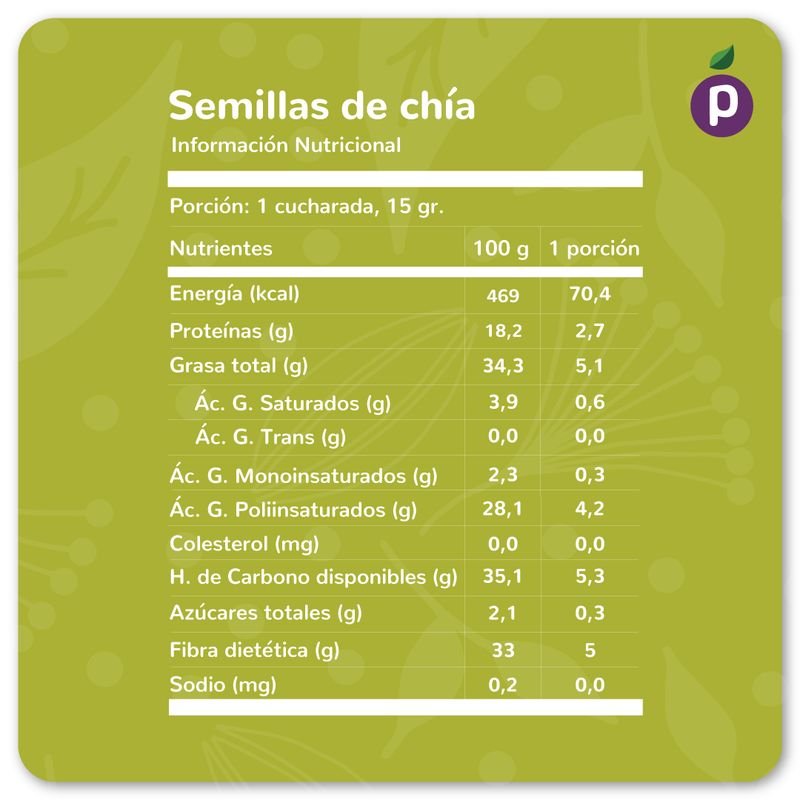 Ingredientes: Chia. Puede contener: Soya, Maní, Leche, Sulfitos, Huevo, otros frutos secos, Sésamo, Mostaza y Lupino.
